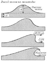 Длина волны тут не важна, по крайней мере до тех пор, пока она много больше глубины. Если в эту формулу подставить числа, то для глубины 4 км получится 200 м/сек! Однако как только волна выходит на мелководье, скорость резко падает: при глубине 10 м скорость составляет всего 10 м/сек.Это очень важная формула. Она показывает, что цунами не надо представлять себе "баллистически" — т.е. так, словно большая масса воды "по инерции" разлетается во все стороны от очага с постоянной скоростью. Цунами — это "коллективный эффект", зависящий не столько от самой среды, сколько от "граничных условий", т.е. от формы водоема.Ну и конечно не надо смешивать скорость перемещения волны и скорость течения воды. Сама вода движется довольно медленно: ее скорость примерно в x/h раз меньше скорости волны, где x — это амплитуда волны, h — глубина океана; т.е. в открытом океане примерно на 4 порядка меньше скорости волны. ОпрокидываниеИз такой формулы для скорости цунами вытекают еще два следствия.Первое — при выходе на мелководье высота волны растет. Картинка тут простая: передная часть колебания, выйдя на мелководье, резко притормаживается, задняя ее догоняет, и вода поднимается. Можно еще сказать так: в пренебрежении потерями энергии на трение о дно и вязкость, продольное сжатие волны означает повышение плотности энергии, а значит, рост высоты волны.