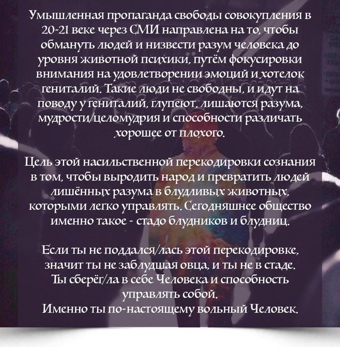 В современном обществе, где тёмными силами умышленно и последовательно в течении последних нескольких веков, уничтожалась традиционная культура, народам Земли насильно были НАВЯЗАНЫ ложные, суррогатные, искусственно выдуманные теории: атеизм, коммунизм, социализм, капитализм, феминизм и т.д. Эти поведенческие установки устанавливаются в сознание человека с детства через общество, СМИ, фильмы, книги, музыку, искусство и т.д.