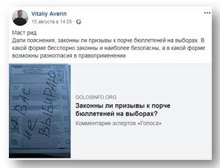 «Голос» и раньше занимался антироссийской деятельностью и не раз призывал портить избирательные бюллетени, достаточно взглянуть на пост координатора сети региональных отделений движения «Голос» Виталия Аверина.