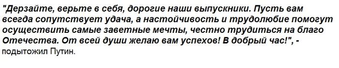 Путин пожелал, чтобы каждый выпускник смог найти своё призвание и выбрать дело, которое будет по душе. Глава государства выразил надежду, что в будущем выпускники станут грамотными специалистами и реализуют свой потенциал. В дальнейшем это поможет стать хорошим гражданином России, участвовать в развитии страны и формировании её будущего.