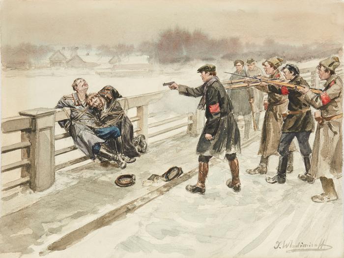 Вот такие картины. По-моему, очень сильная серия. Мне кажется, если бы с советских учебниках по истории публиковали их, а не пафосные картинки с «революционными матросами», то отношение к событиям 1917 года у людей было бы совсем иное.