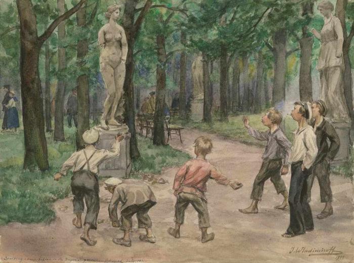 08. Картина под названием «Развлечение подростков в императорском саду».Тут, как говорится, без комментариев — искусство после революции стало «доступно всем». В том числе, и для того, чтобы бросать в него камнями.